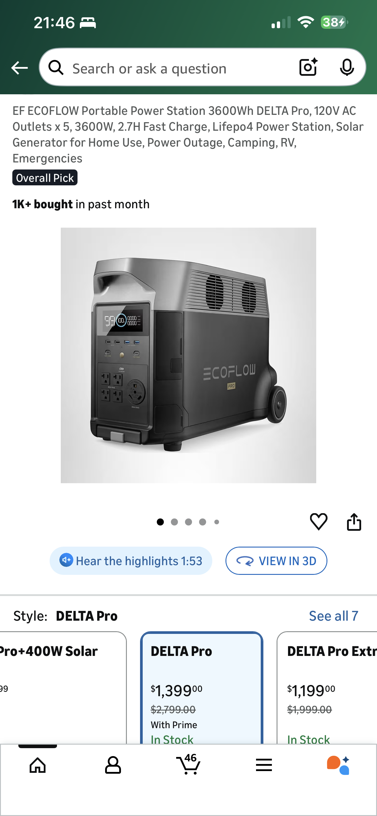 Amazon $1399 不包税,只有一半价,全新没有使用过,微信hua348280 EF ECOFLOW Portable Power Station 3600Wh DELTA Pro, 120V AC Outlets x 5, 3600W, 2.7H Fast Charge, Lifepo4 Power Station, Solar Generator for Home Use, Power Outage, Camping, RV, Emergencies