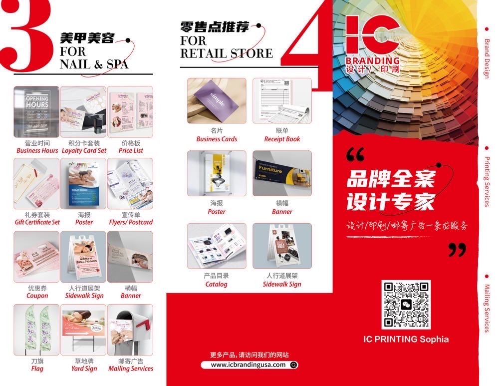 🔥【美国印刷设计】 大家好呀!我们是在美国做印刷设计的, 今天来给大家安利一波我们的产品! 无论是菜单、名片、海报还是邮寄广告, 我们都能帮你搞定。 🇺🇸📬 邮寄广告直送家门口,共享菜单 $1065/一万张! 越来越多餐饮,美容指甲店老板都在用! 🔥 覆盖广,曝光快 💰 高性价比,小预算大效果 想让更多人知道你家的美食? ☎️:3479518911 微信:ICPRINTING1 更多详情:www.icbrandingusa.com