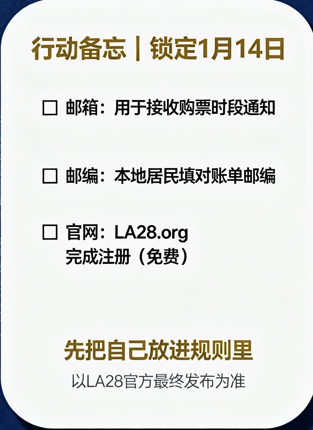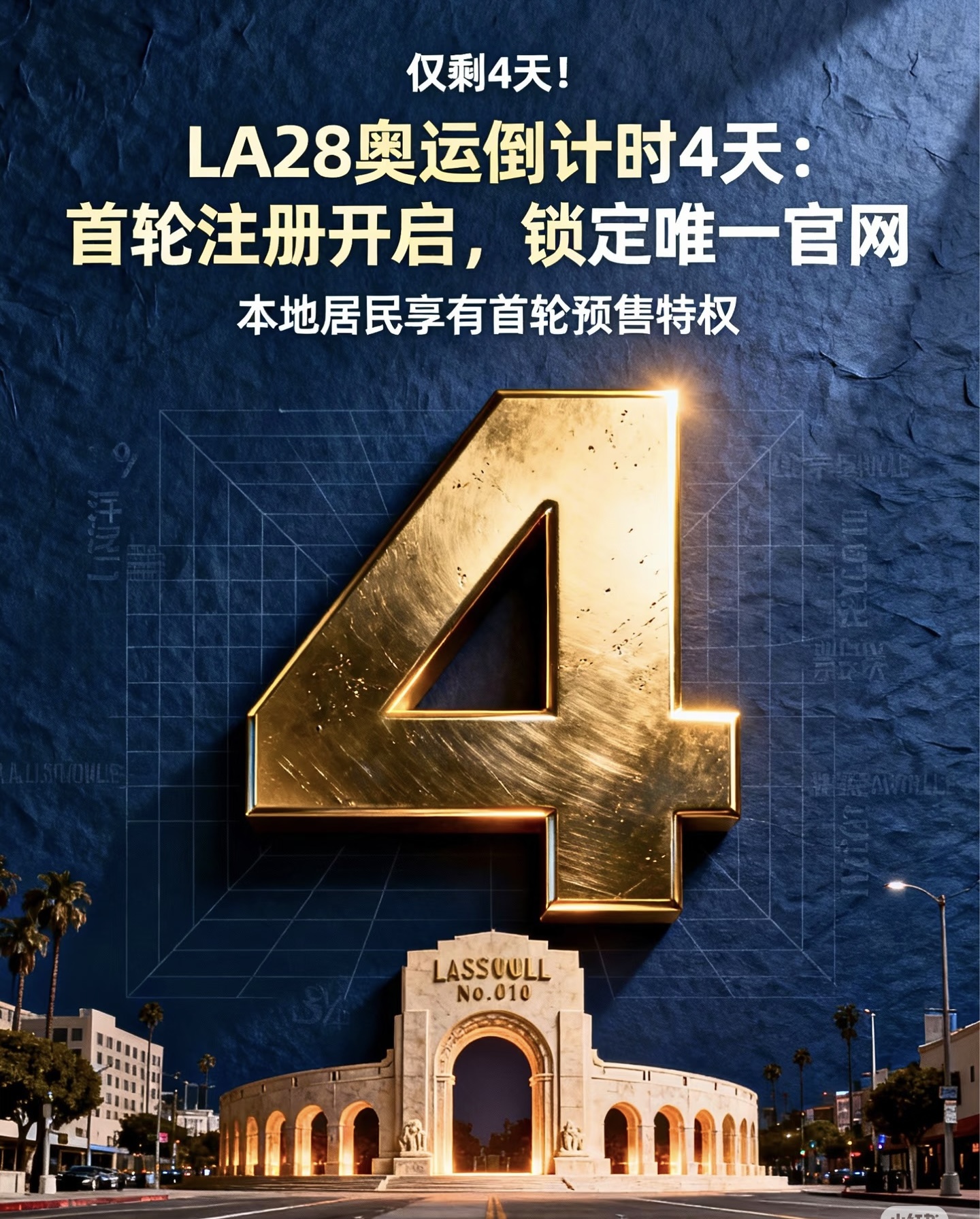 距离 2028洛杉矶奥运会(LA28) 官方首轮注册开启仅剩最后 4天! 奥运门票不是单纯的财力竞争,而是一场关于信息差与规则理解的长弈。 如果你不在 1月14日 登录官网留下名字,你将全线丧失4月份的首轮购票资格。
