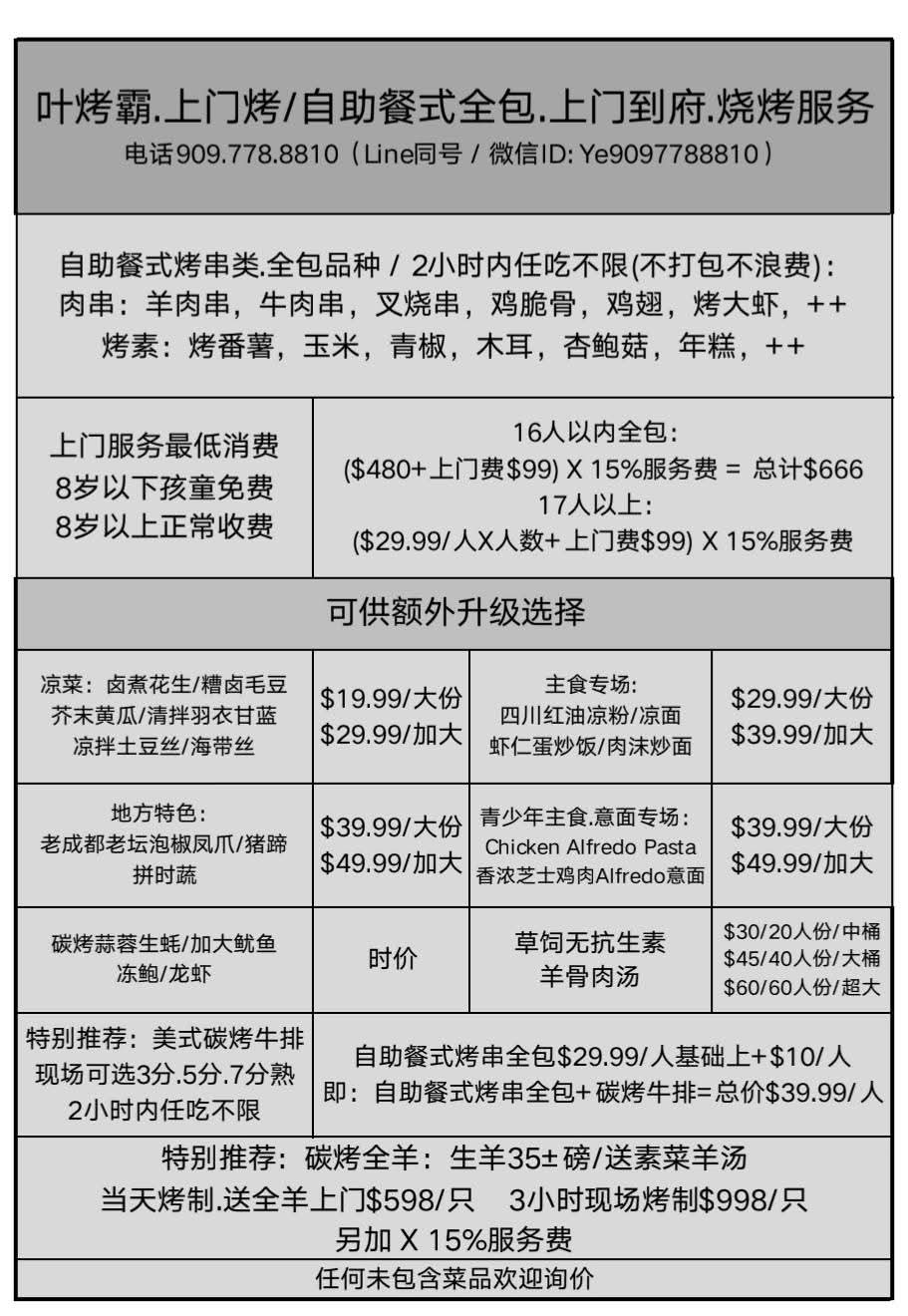 叶烤霸烧烤店 中华传统羊肉串文化传播交流大使 洛杉矶&尔湾,909.778.8810 聚会上门,到府烧烤。自助餐式全包服务烤串。炭烤全羊整猪。美式炭烤牛扒 Chino Hills,Chino Hills, CA, United States.California +1909-778-8810 YeKaoBa@amail.com 24小时营业、外送及预订。