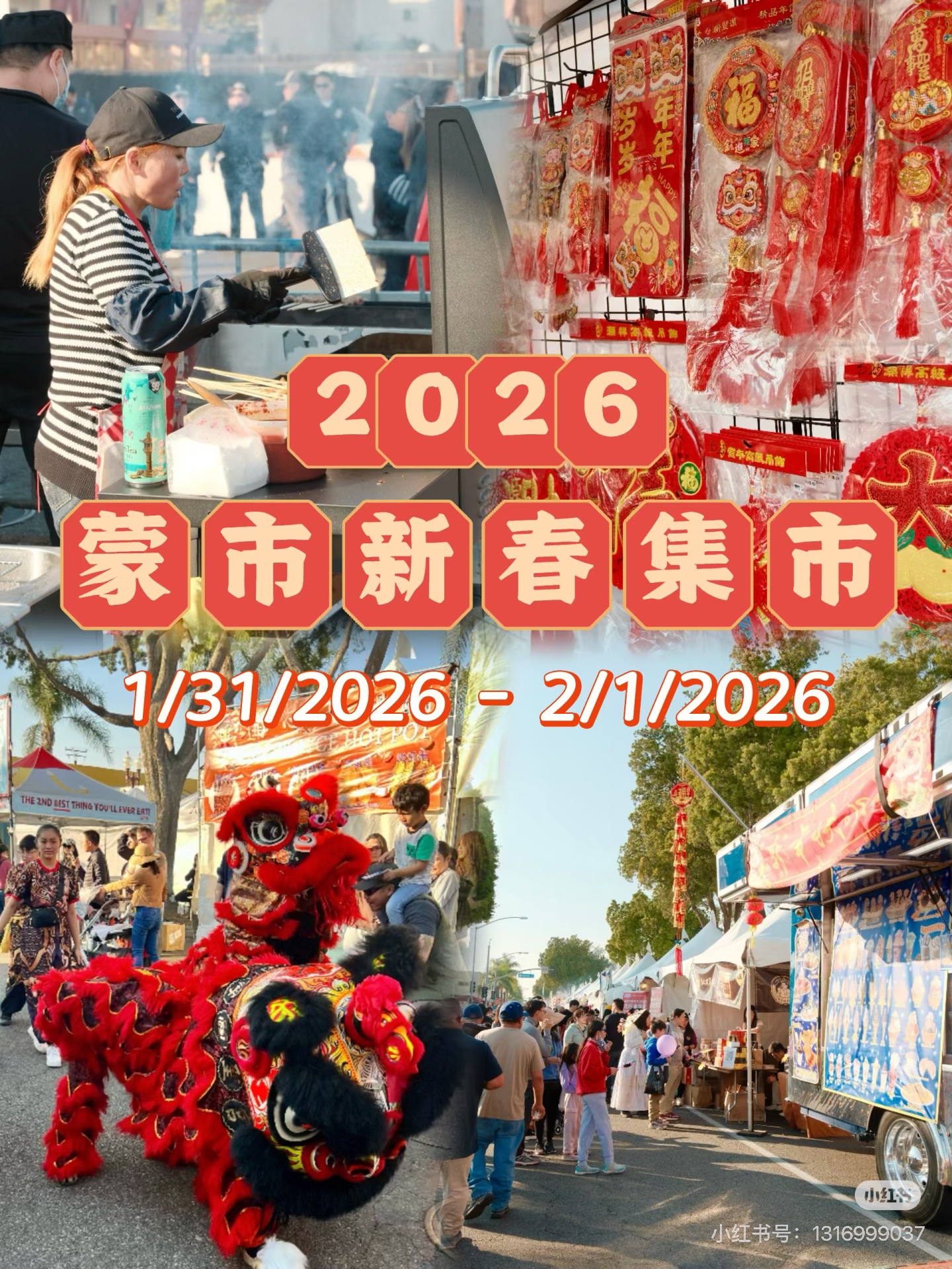 2026马年蒙市新春集市的时间已经定啦~就在1/31/26和2/1/26这两天~ 跟往年一样在Garvey Ave上,从Alhambra Ave到Garfield Ave 之间。 开车可以定位到路口的德诚行: 📍401 E Garvey Ave, Monterey Park, CA 91755 两边居民区都可以免费街趴。不过新春集市人会很多,空的停车位可能会离得比较远。 配图是去年新春集市的一些照片~
